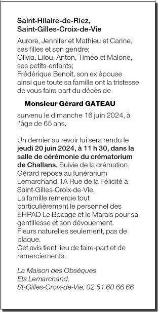 Cet espace « condoléances » est dédié à la mémoire de Monsieur Gérard GATEAU.
