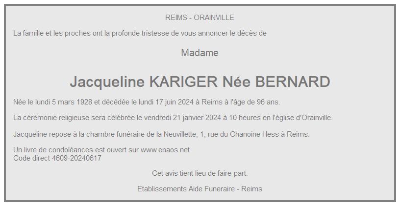 Cet espace « condoléances » est dédié à la mémoire de Madame Jacqueline KARIGER Née BERNARD.