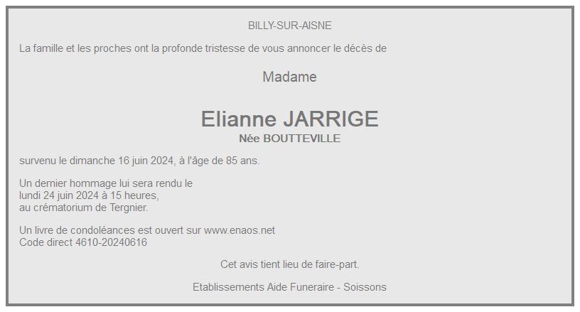 de Madame Elianne JARRIGE née BOUTTEVILLE