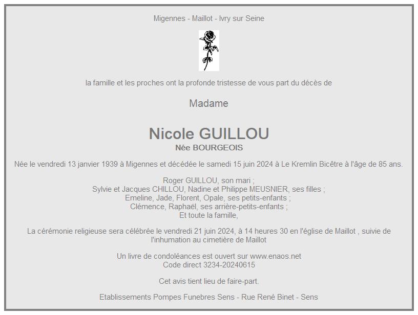 Cet espace « condoléances » est dédié à la mémoire de Madame Nicole GUILLOU née BOURGEOIS.