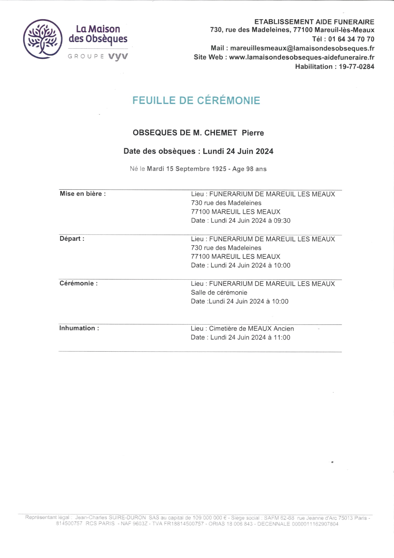 Cet espace « condoléances » est dédié à la mémoire de Monsieur Pierre CHEMET.