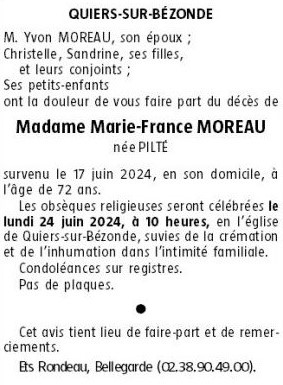Cet espace « condoléances » est dédié à la mémoire de Madame Marie-France MOREAU née PILTÉ.