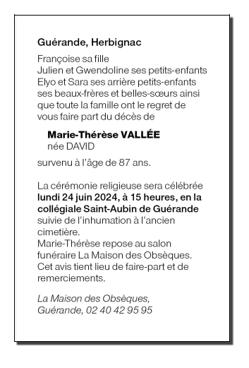 Cet espace « condoléances » est dédié à la mémoire de Madame Marie VALLÉE née DAVID.