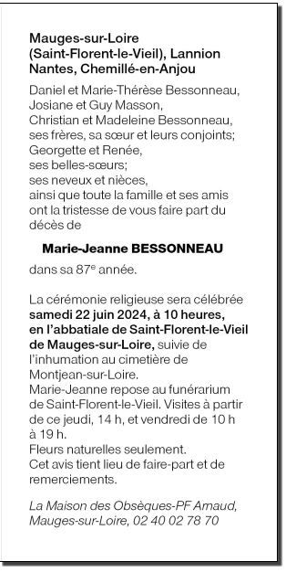 Cet espace « condoléances » est dédié à la mémoire de Madame Marie-Jeanne BESSONNEAU.