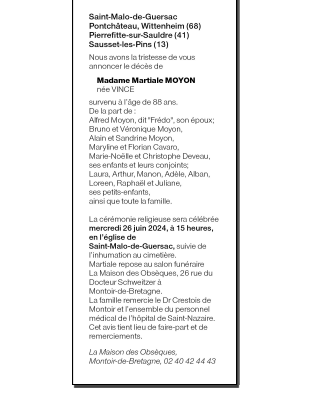 Cet espace « condoléances » est dédié à la mémoire de Madame Martiale MOYON née VINCE.