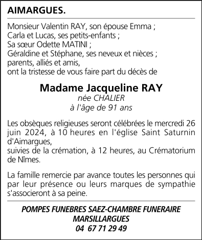 de Madame Jacqueline née RAY née CHALIER