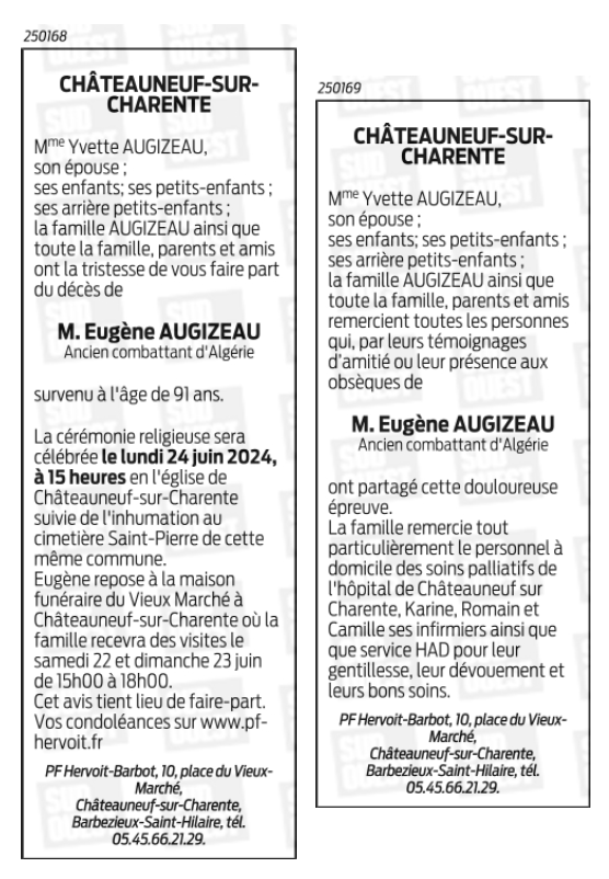 Cet espace « condoléances » est dédié à la mémoire de Monsieur Eugène AUGIZEAU.