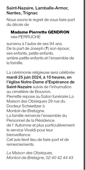 Cet espace « condoléances » est dédié à la mémoire de Madame Pierrette GENDRON née PERRUCHE.