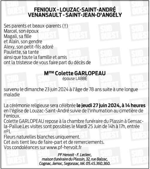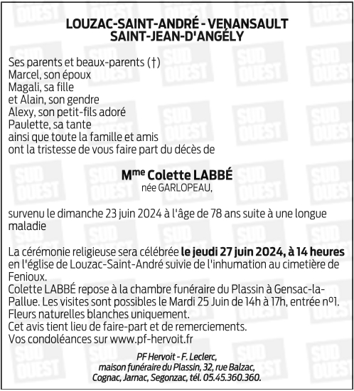 Cet espace « condoléances » est dédié à la mémoire de Madame Colette LABBÉ née GARLOPEAU.