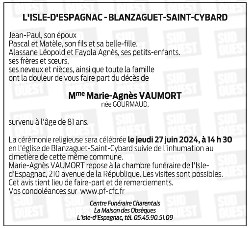 Cet espace « condoléances » est dédié à la mémoire de Madame Marie-Agnès VAUMORT née GOURMAUD.