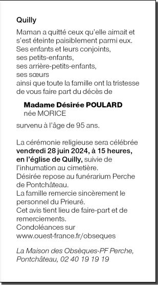 Cet espace « condoléances » est dédié à la mémoire de Madame Désirée POULARD née MORICE.