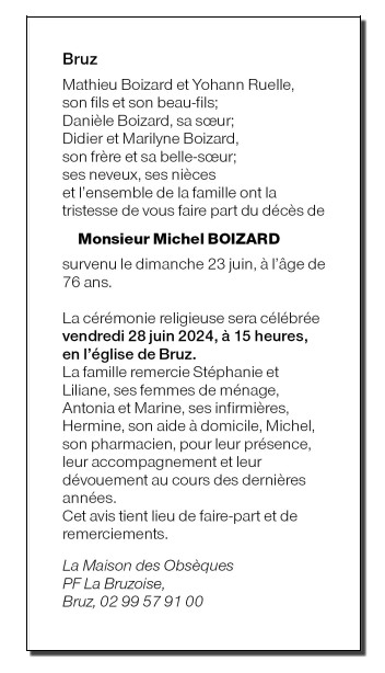 Cet espace « condoléances » est dédié à la mémoire de Monsieur Michel BOIZARD.