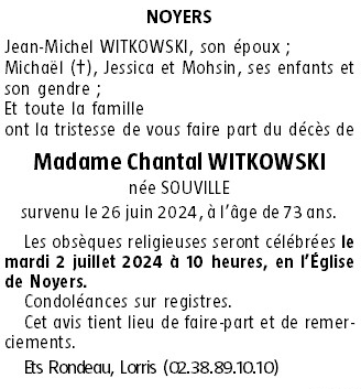 Cet espace « condoléances » est dédié à la mémoire de Madame Chantal WITKOWSKI née SOUVILLE.