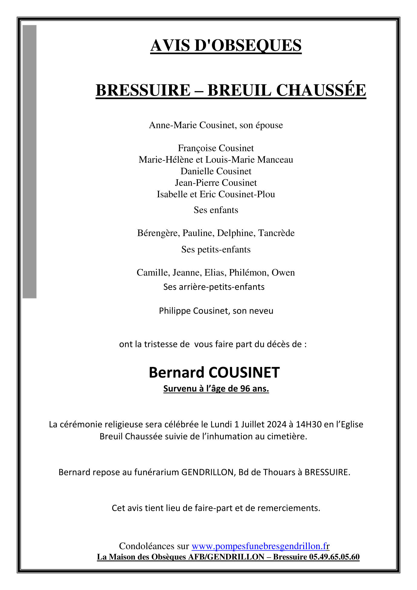 Décédé à Bressuire (79300) le jeudi 27 juin 2024