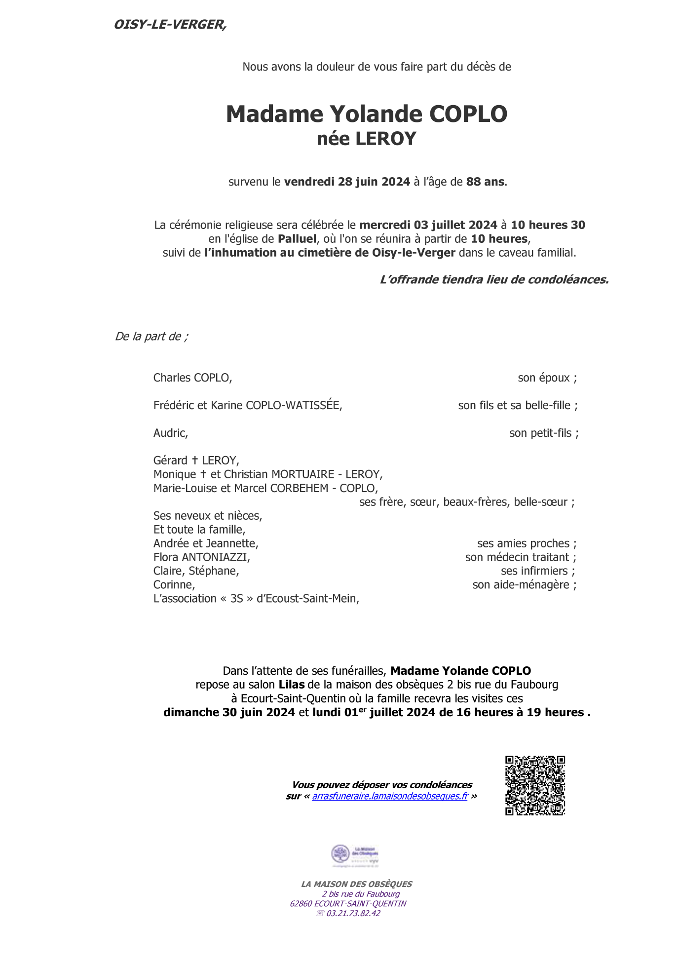 de Madame Yolande COPLO née LEROY