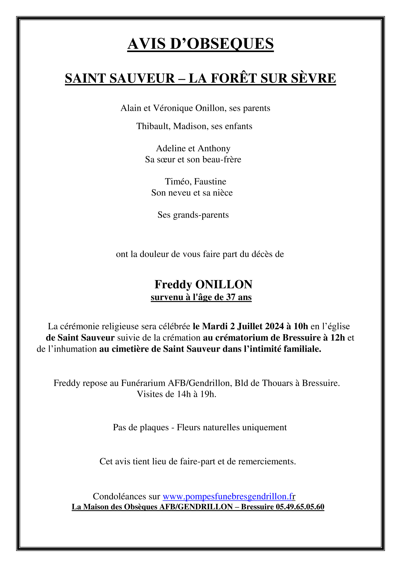 Cet espace « condoléances » est dédié à la mémoire de Monsieur FREDDY ONILLON.