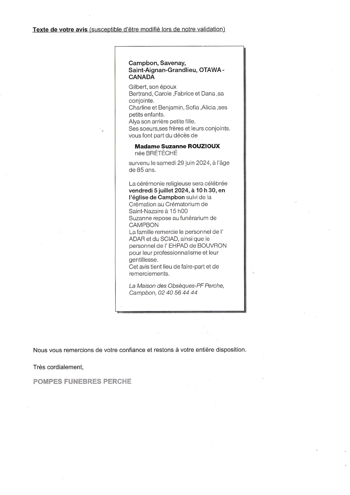 de Madame Suzanne ROUZIOUX née BRETECHE