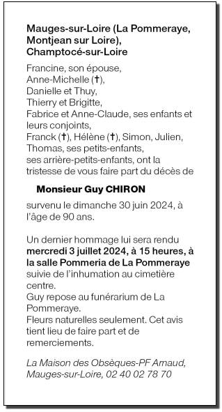 Cet espace « condoléances » est dédié à la mémoire de Monsieur Guy CHIRON.