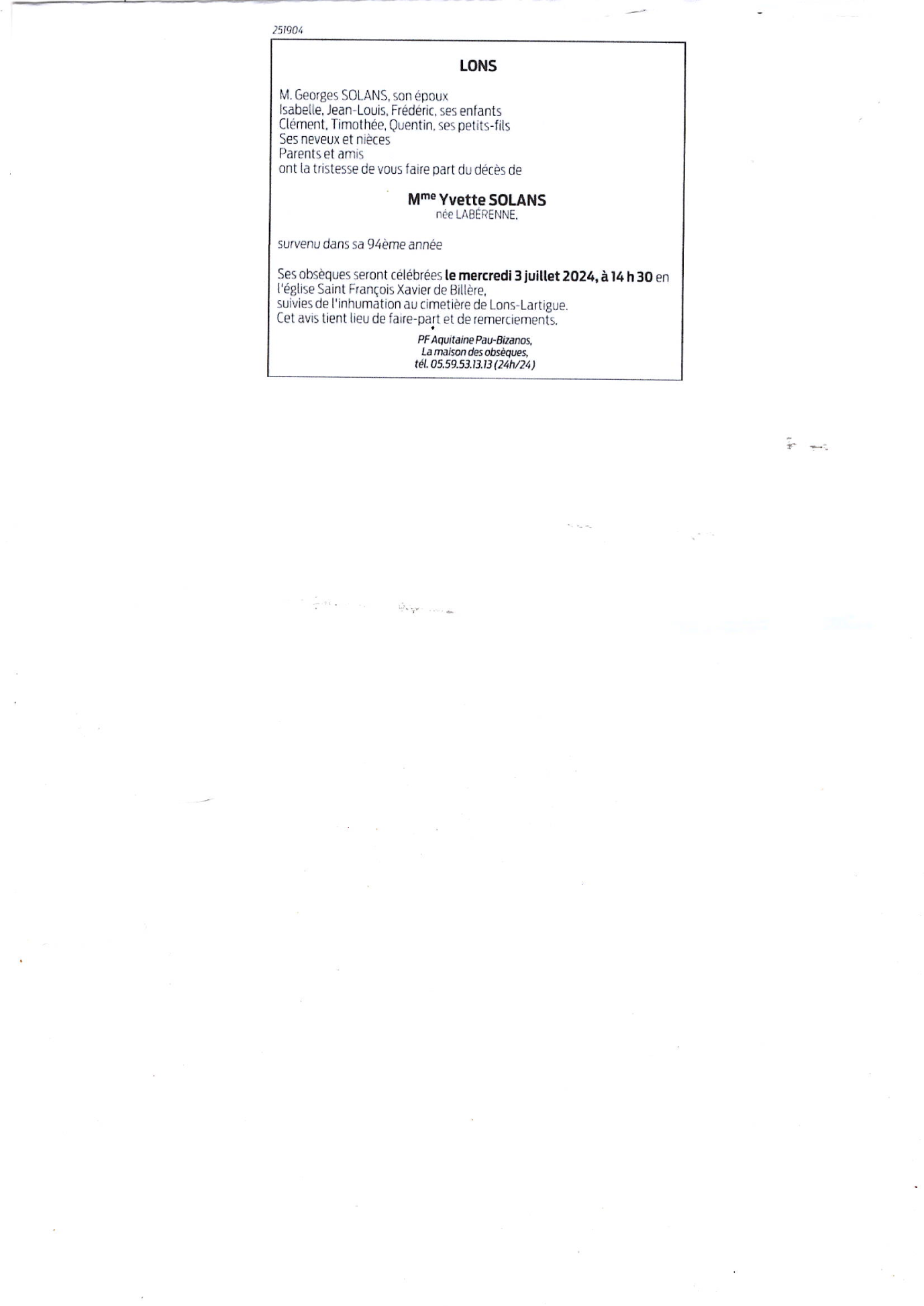 Cet espace « condoléances » est dédié à la mémoire de Madame Yvette SOLANS née LABERENNE.