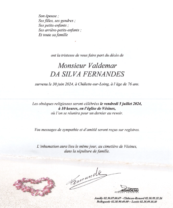 Cet espace « condoléances » est dédié à la mémoire de Monsieur Valdemar DA SILVA FERNANDES.