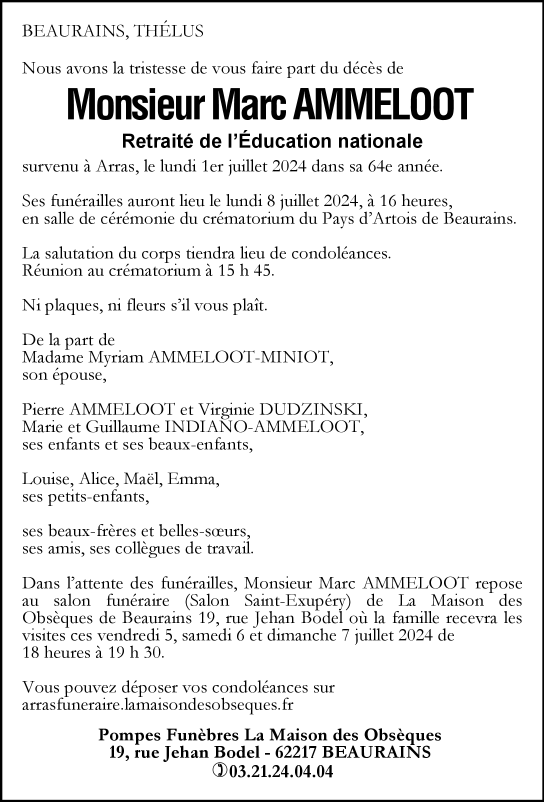 Cet espace « condoléances » est dédié à la mémoire de Monsieur Marc AMMELOOT.