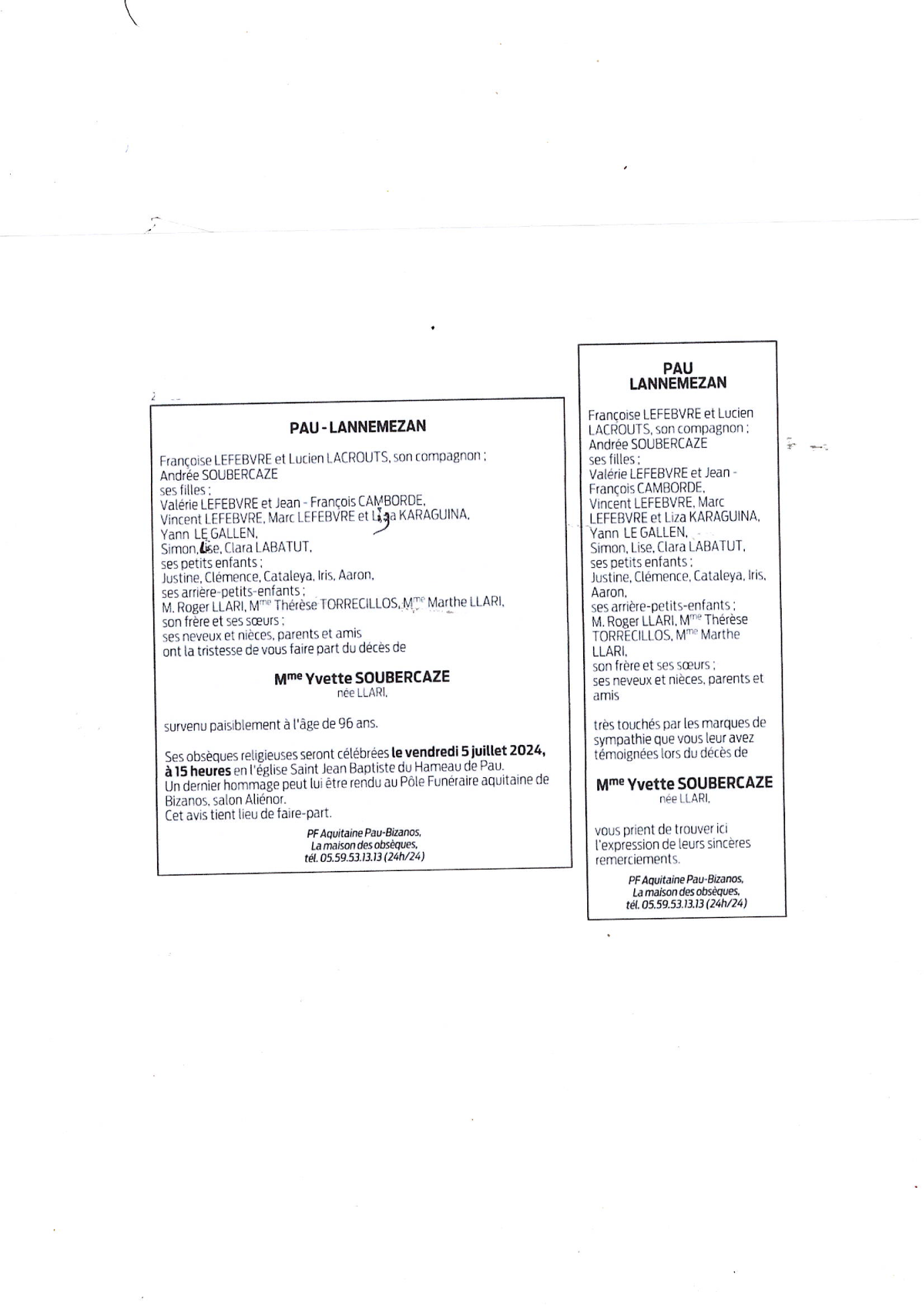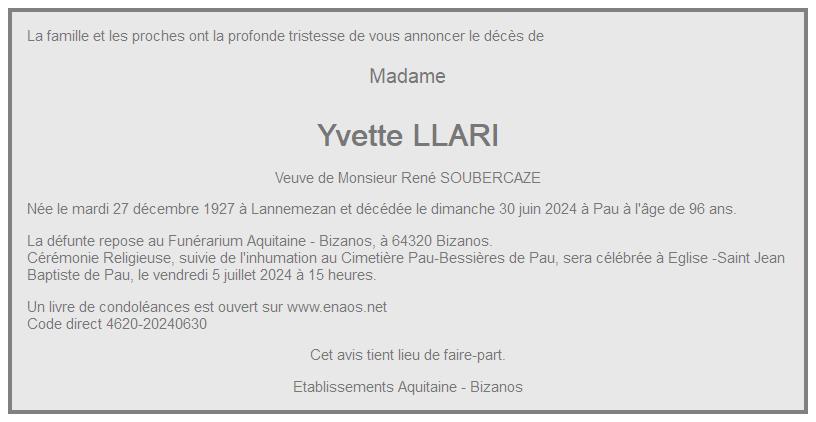 de Madame Yvette SOUBERCAZE née LLARI