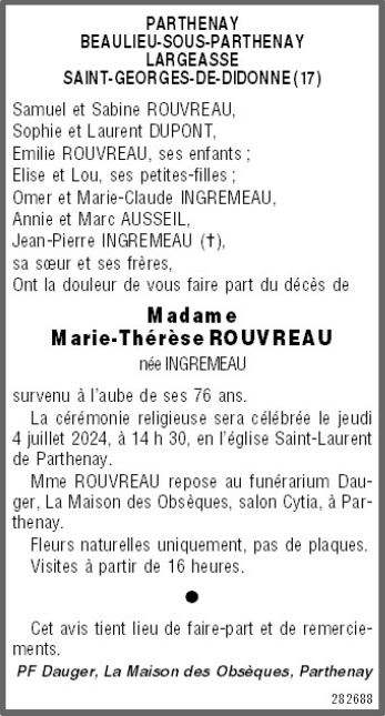 de Madame Marie-Thérèse ROUVREAU née INGREMEAU