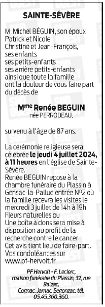Cet espace « condoléances » est dédié à la mémoire de Madame Renée BÉGUIN née PERRODEAU.