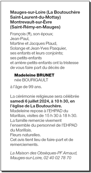 Cet espace « condoléances » est dédié à la mémoire de Madame Madeleine BRUNET née BOURIGAULT.