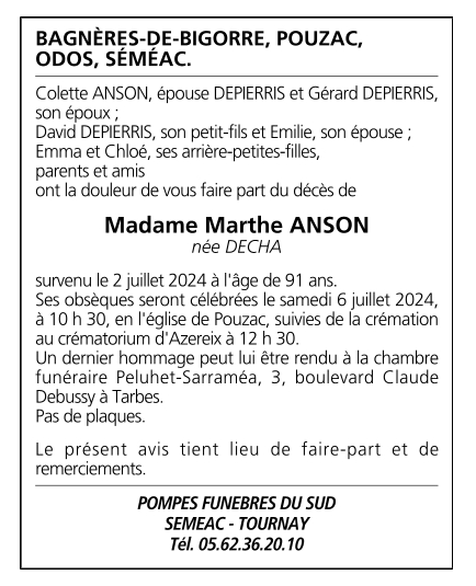 de Madame Marthe ANSON née DECHA