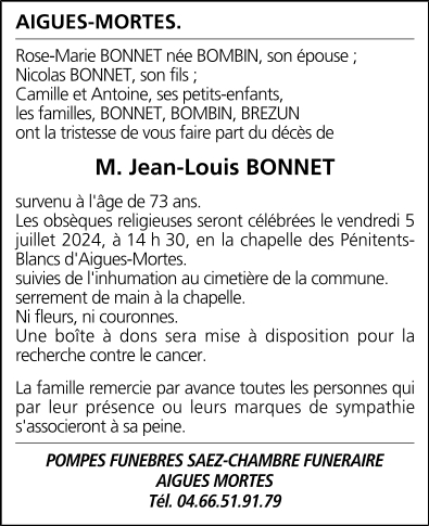 Cet espace « condoléances » est dédié à la mémoire de Monsieur Jean-Louis BONNET.
