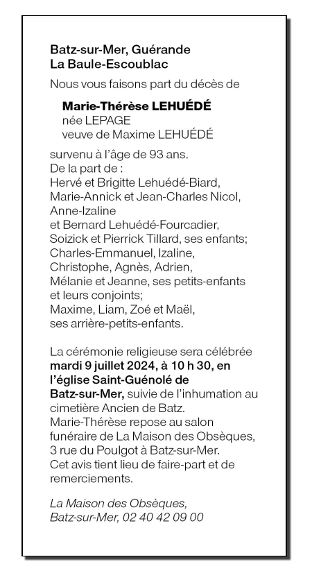 de Madame Marie LEHUÉDÉ née LEPAGE