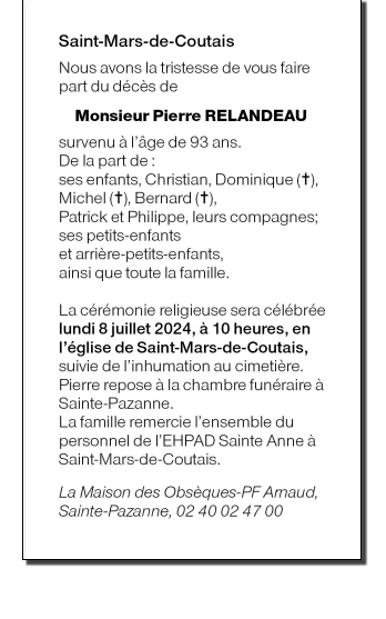 Décédé à Saint-Mars-de-Coutais (44680) le jeudi 4 juillet 2024