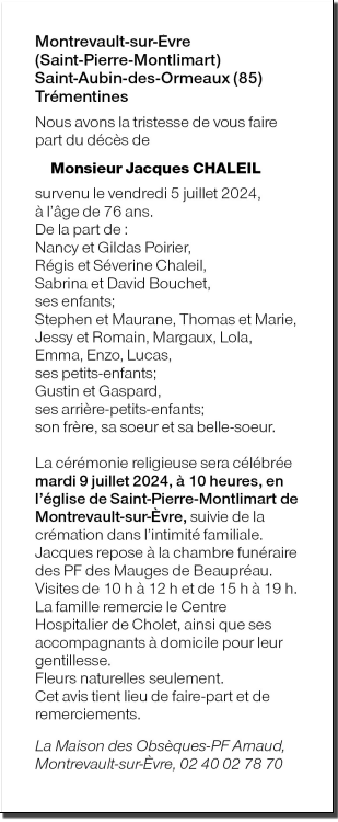 Décédé à Saint Pierre Montlimart (49110) le vendredi 5 juillet 2024