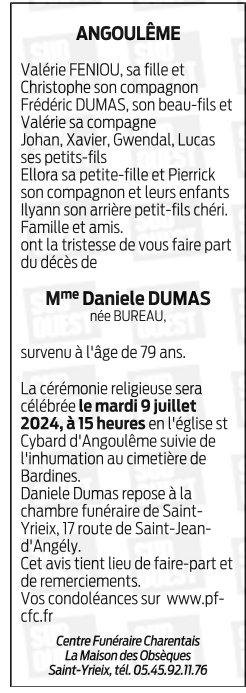 Cet espace « condoléances » est dédié à la mémoire de Madame Daniele DUMAS née BUREAU.