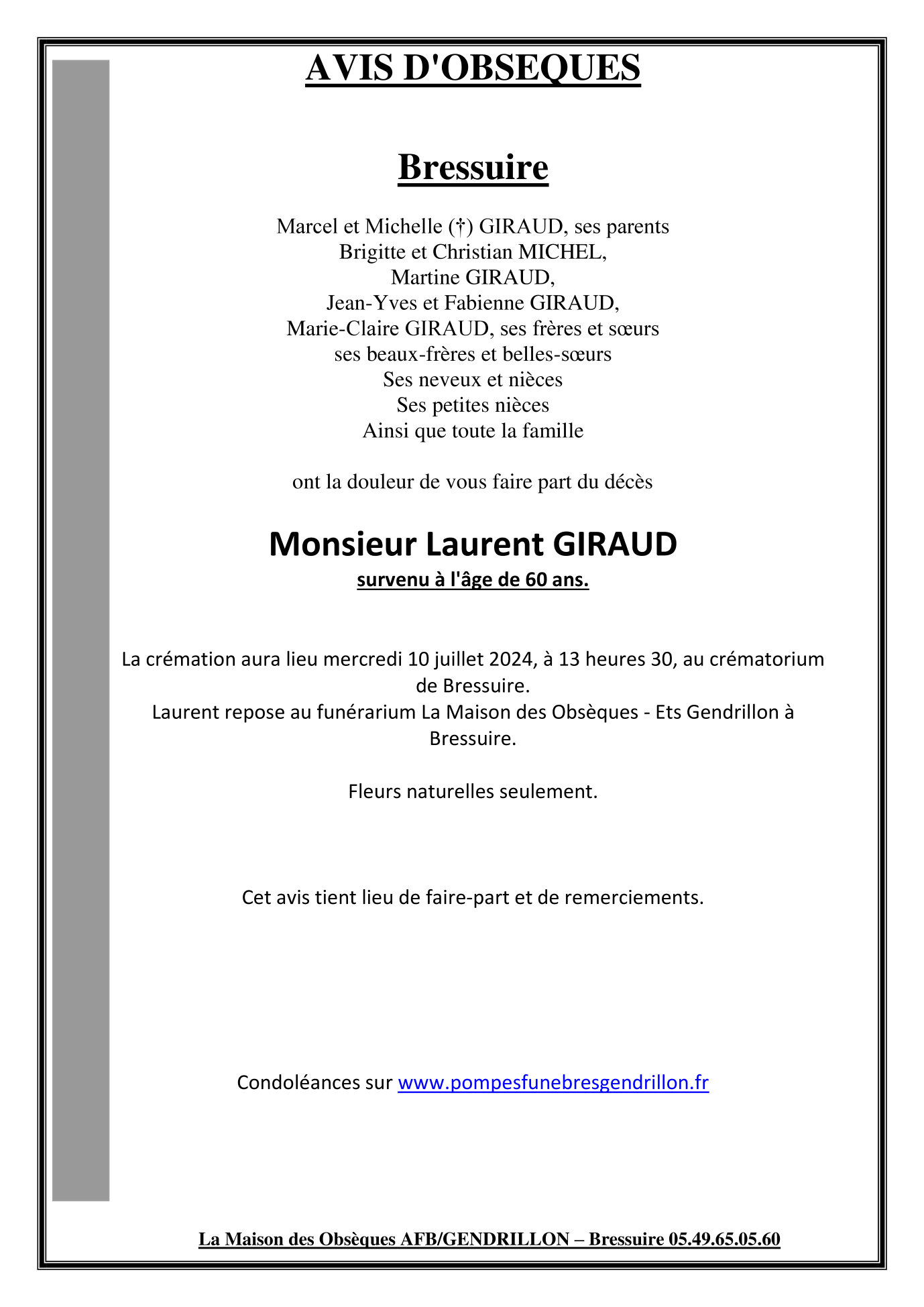 Cet espace « condoléances » est dédié à la mémoire de Monsieur Laurent GIRAUD.
