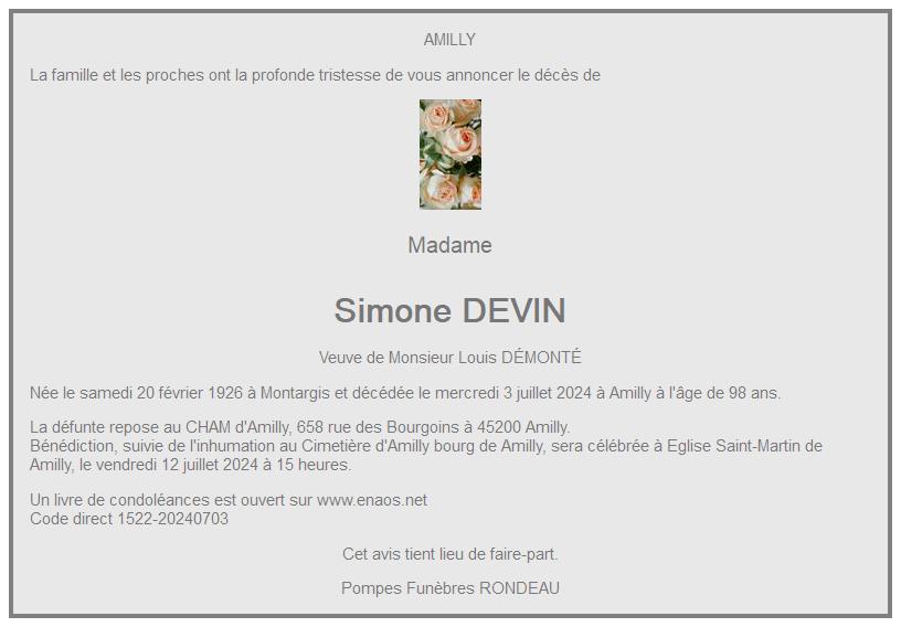 Cet espace « condoléances » est dédié à la mémoire de Madame Simone DÉMONTÉ née DEVIN.
