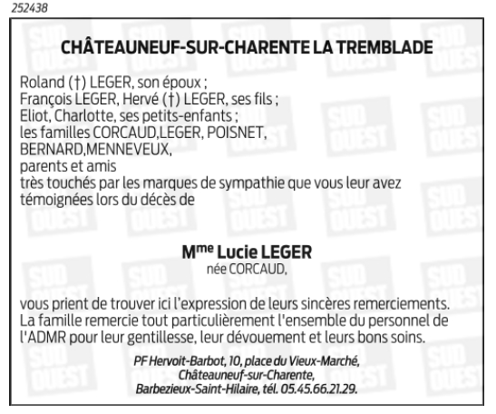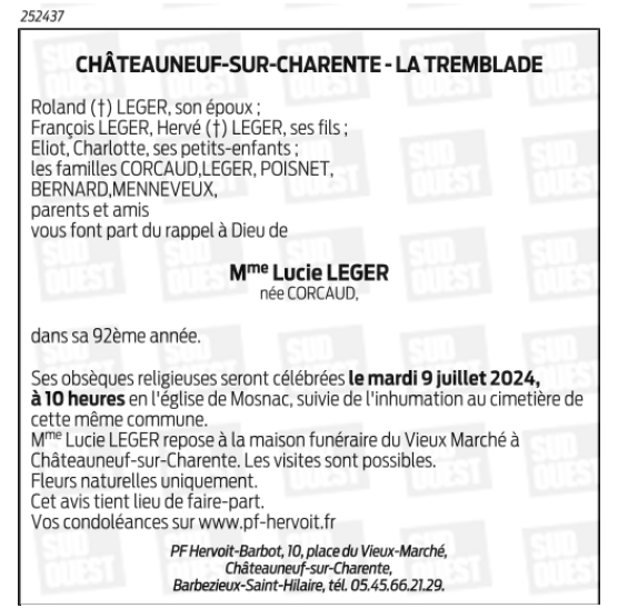 Cet espace « condoléances » est dédié à la mémoire de Madame Lucie LEGER née CORCAUD.