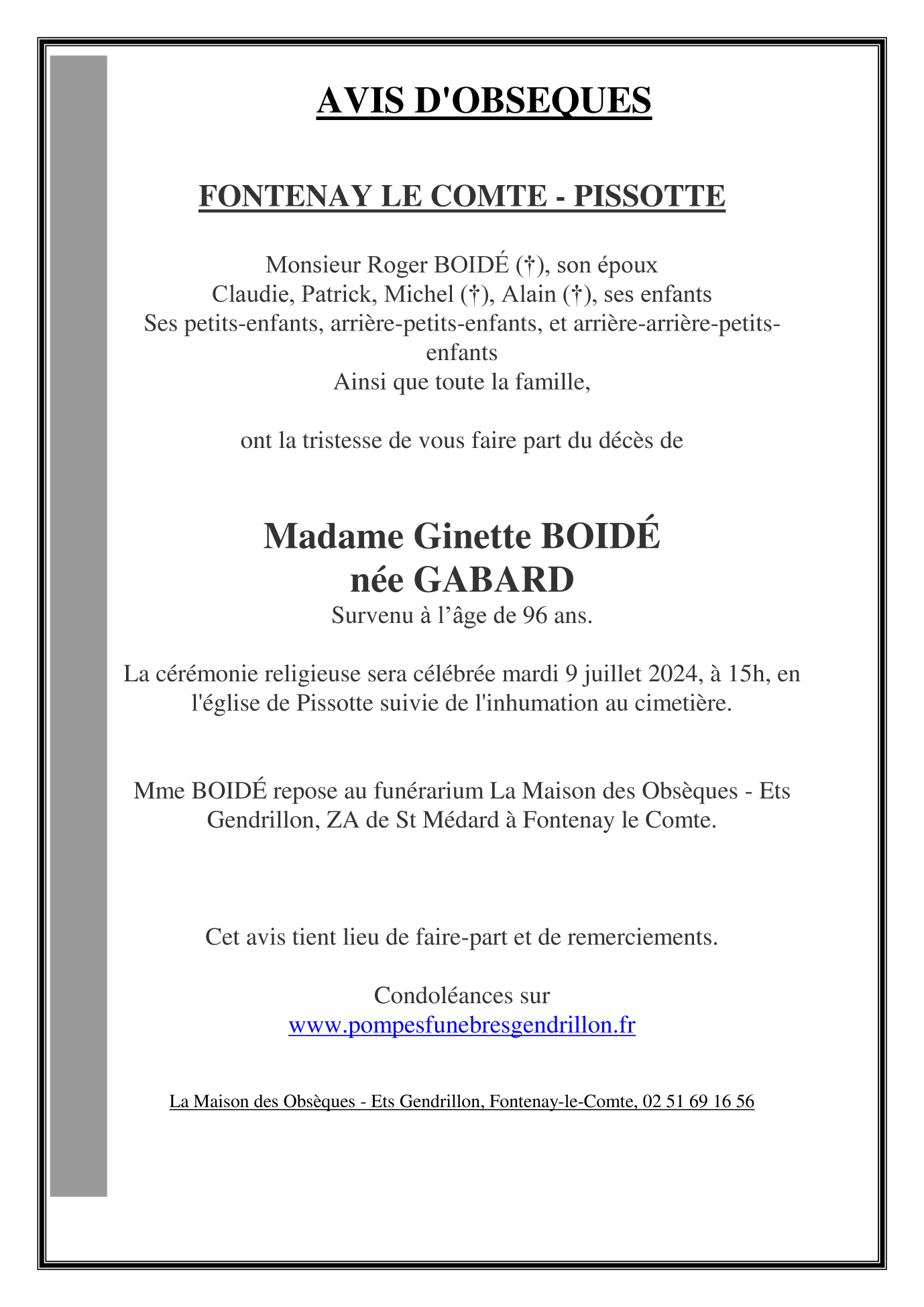 Cet espace « condoléances » est dédié à la mémoire de Madame Ginette BOIDÉ née GABARD.