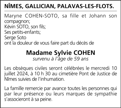 Cet espace « condoléances » est dédié à la mémoire de Madame Sylvie COHEN.