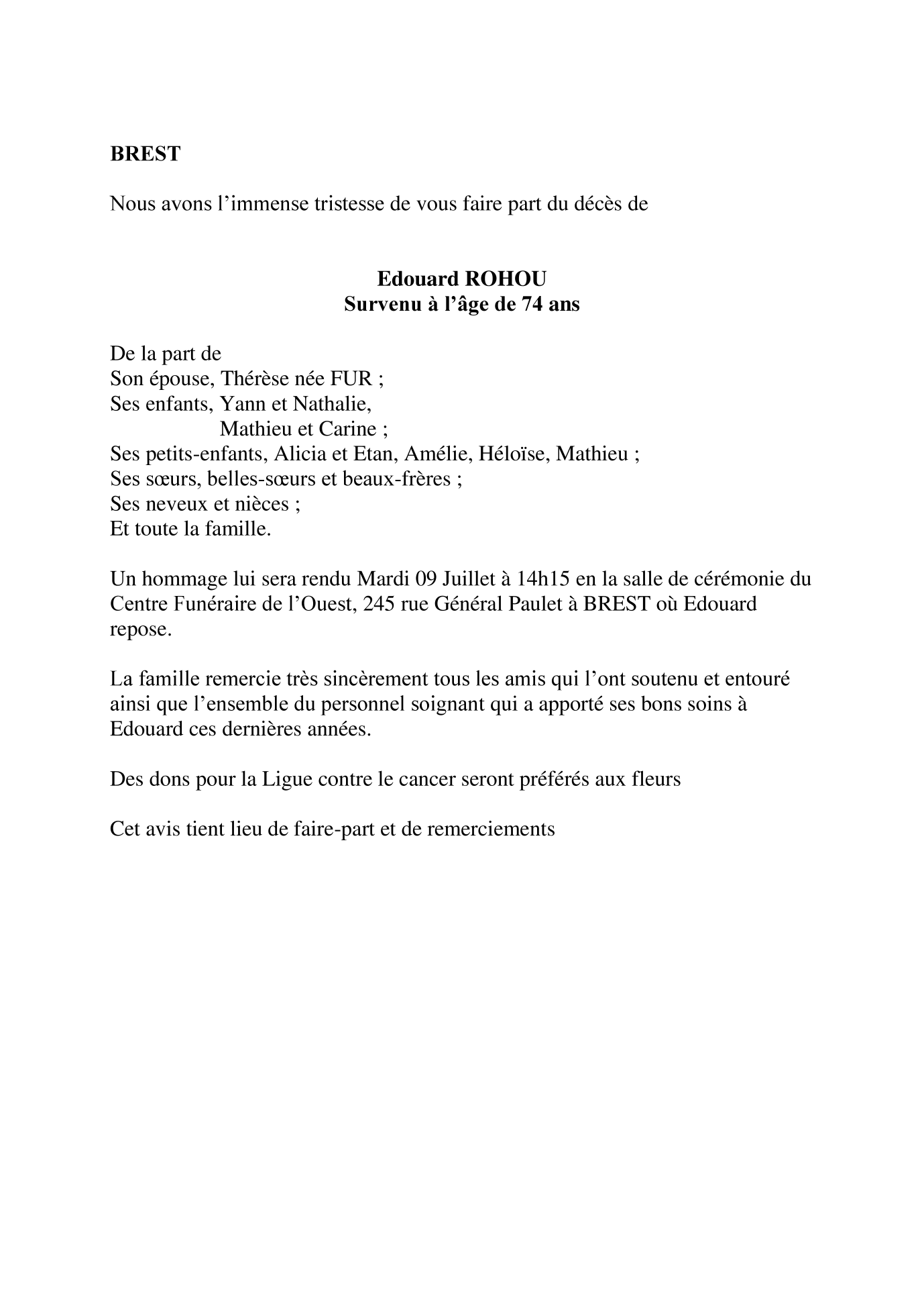 Cet espace « condoléances » est dédié à la mémoire de Monsieur Edouard ROHOU.