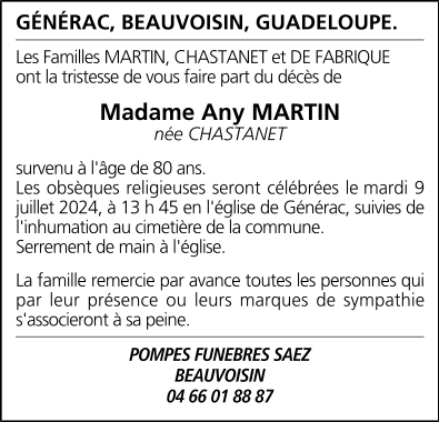 Cet espace « condoléances » est dédié à la mémoire de Madame Any MARTIN née CHASTANET.
