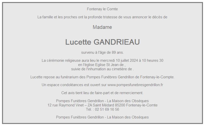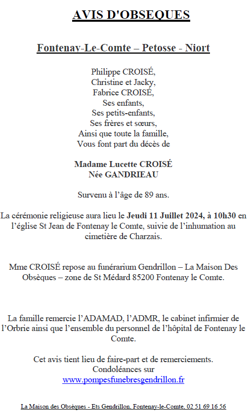 Cet espace « condoléances » est dédié à la mémoire de Madame Lucette CROISÉ née GANDRIEAU.