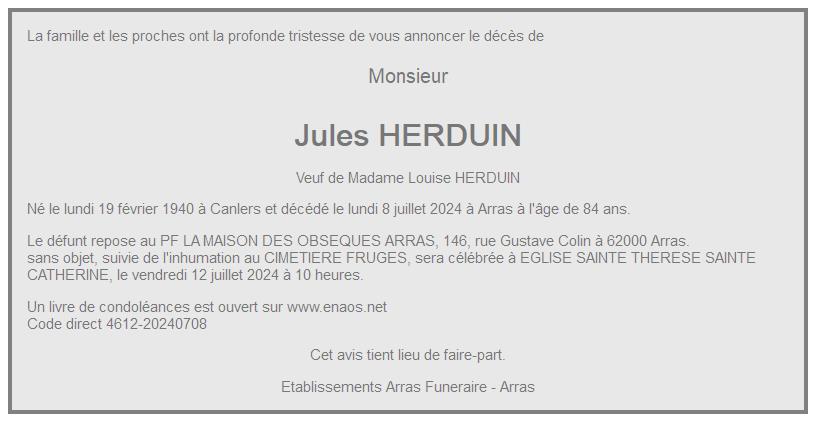 Cet espace « condoléances » est dédié à la mémoire de Monsieur Jules HERDUIN.