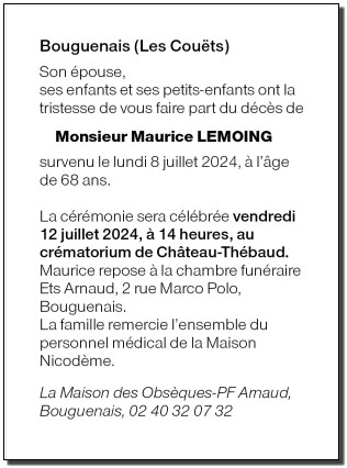 Cet espace « condoléances » est dédié à la mémoire de Monsieur Maurice LEMOING.
