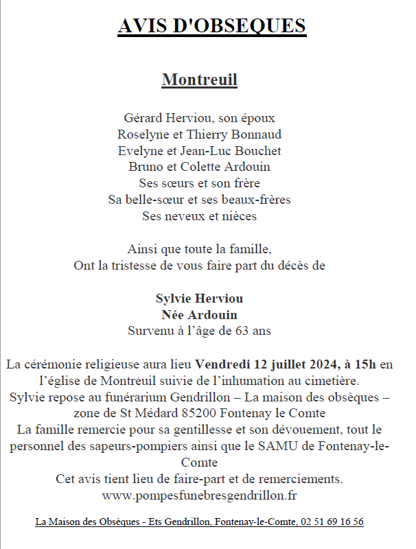Cet espace « condoléances » est dédié à la mémoire de Madame Sylvie HERVIOU née ARDOUIN.