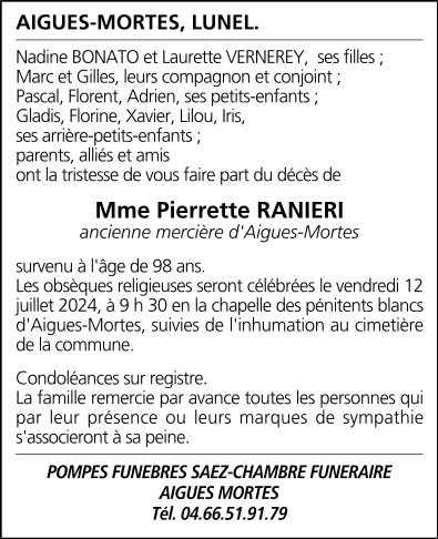 Cet espace « condoléances » est dédié à la mémoire de Madame Pierrette RANIÉRI.