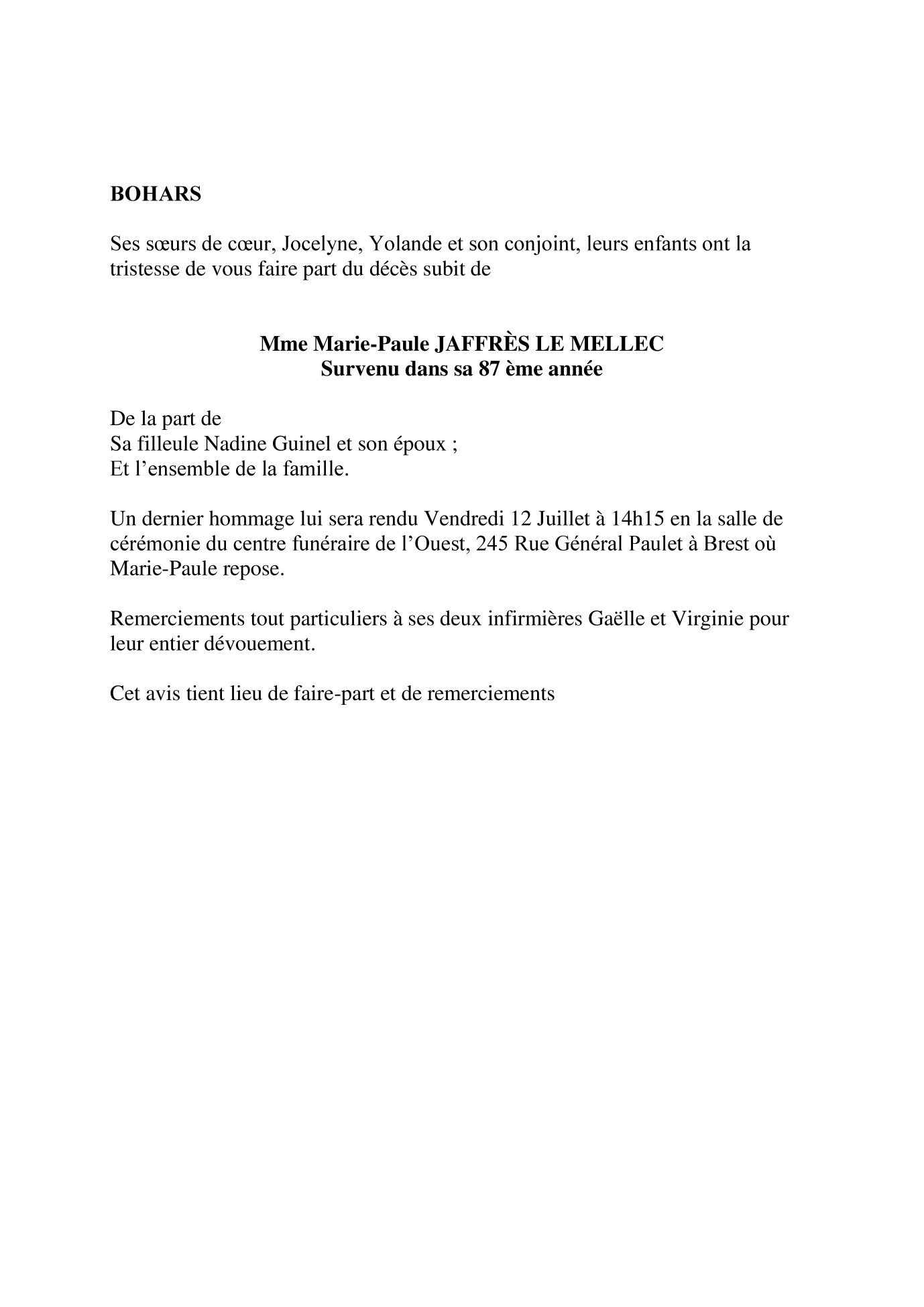 de Madame Marie-Paule LE MELLEC née JAFFRÈS