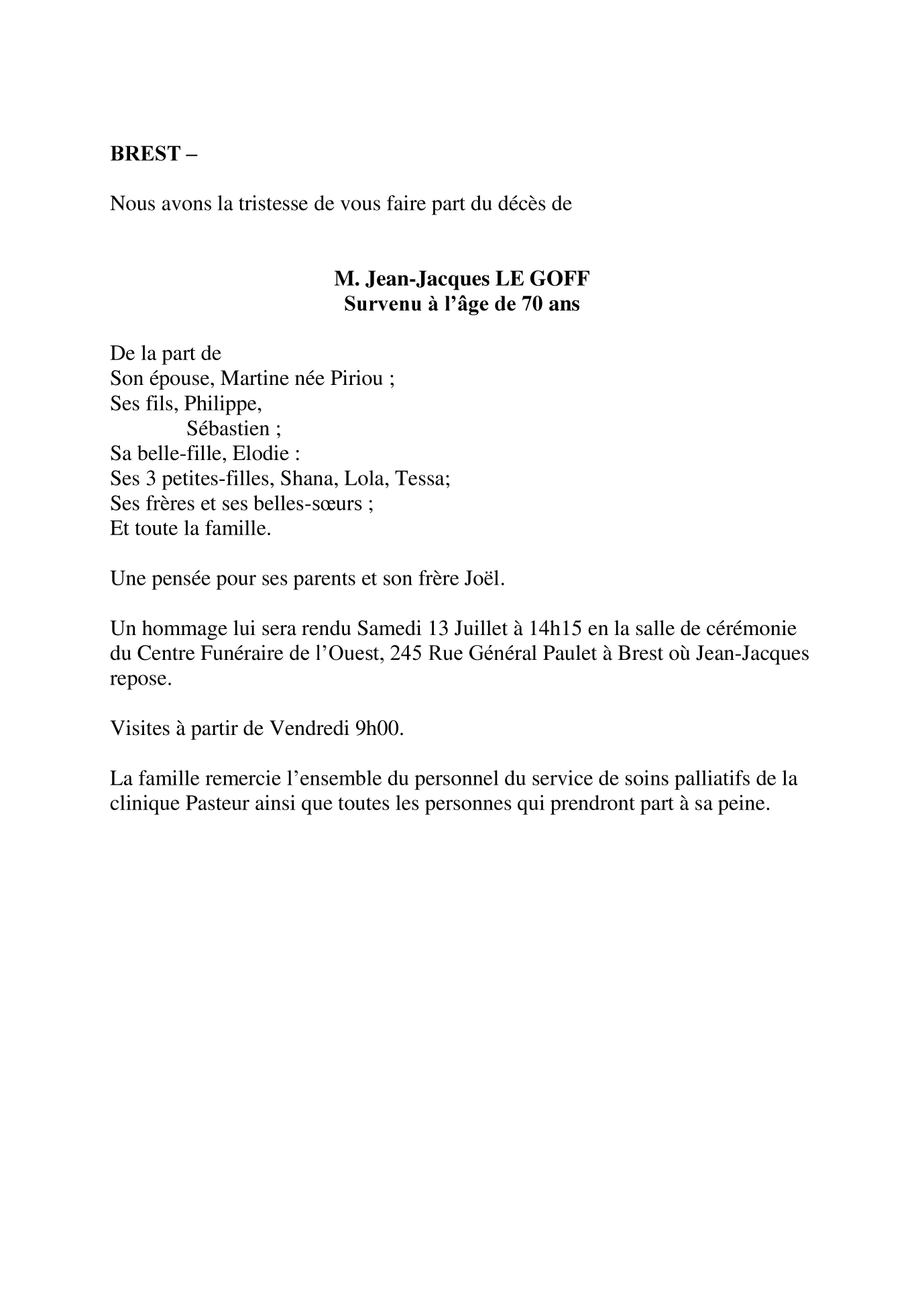 Cet espace « condoléances » est dédié à la mémoire de Monsieur Jean-Jacques LE GOFF.