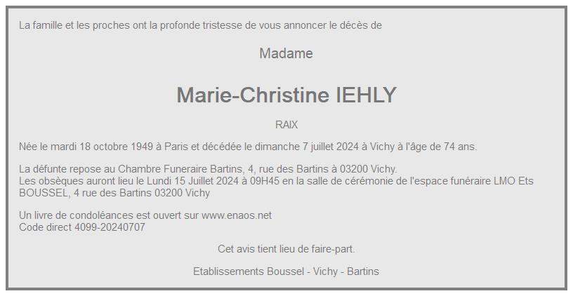 Cet espace « condoléances » est dédié à la mémoire de Madame Marie-Christine née IEHLY.